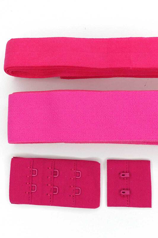 NB: Les fournitures proviennent de différents fournisseurs, c'est pour cela qu'il y a 3 différentes nuances de fuchsia entre les 3 fournitures (une nuance différente entre l'élastique pré-plié, la ceinture et l'agrafage)